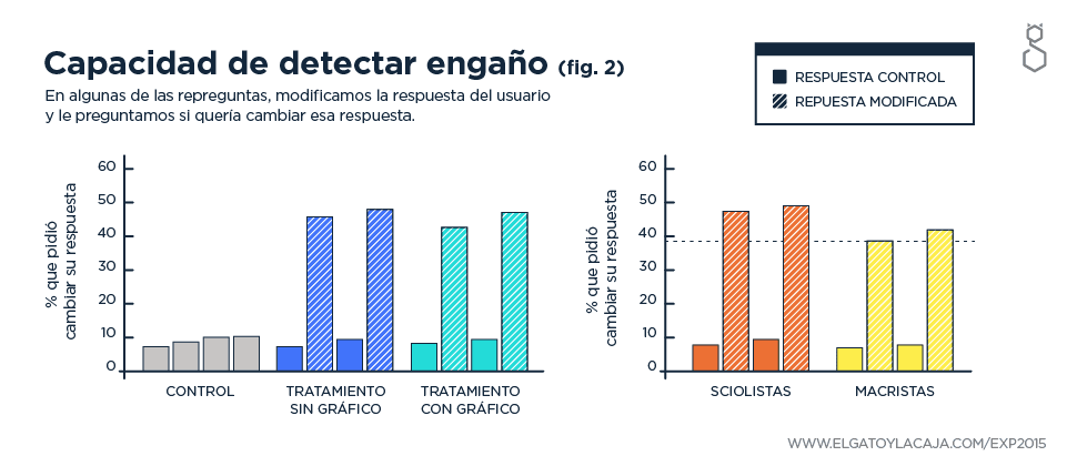 - El interesante: menos del 50% de las personas pidió cambiar las preguntas manipuladas; son quienes advirtieron que esa respuesta no reflejaba sus posiciones.