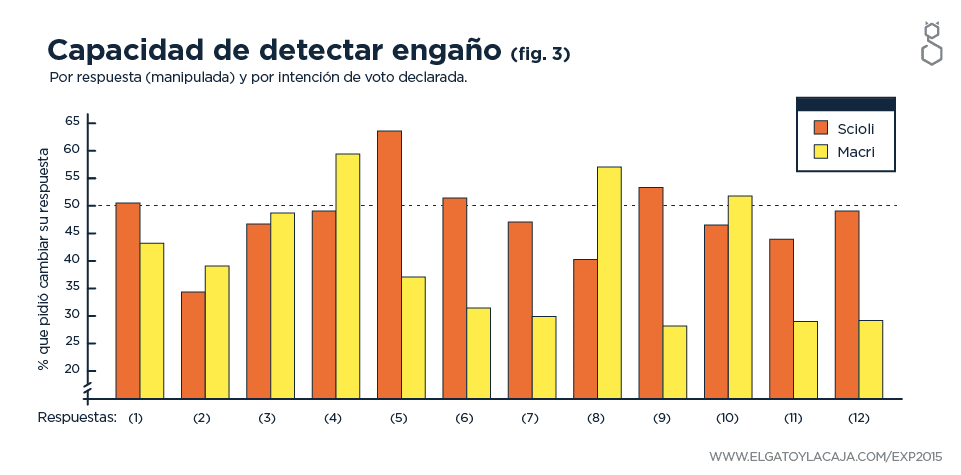 En general, los votantes del espectro sciolista son más sensibles a que se manipulen preguntas que tienen relación con aspectos percibidos como positivos para la gestión actual de gobierno (Ley de Medios, Planes Sociales, Fondos Buitre), mientras que los del espectro macrista identifican más fácilmente la manipulación cuando lo que modificamos son respuestas a preguntas que tienen que ver con la crítica a la gestión actual (autonomía del INDEC y medición de la pobreza).