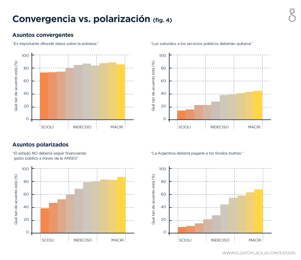 Un dato particularmente relevante surge de analizar las respuestas de diferentes preguntas y ver que, para la mayoría, la polarización fue la esperada, generando posturas antipódicas entre el votante del espectro sciolista y el del espectro macrista (Liberación del tipo de Cambio, Distancia diplomática para con Irán, uso del ANSES para la financiación del gasto público, el Pago a los Fondos Buitres, el plan PRO.CRE.AR vs. los créditos hipotecarios), mientras que otras fueron sorprendentemente unánimes, tanto para votantes siolistas como macristas (el mantenimiento de los subsidios, la necesidad de mejorar la autonomía del INDEC, la implementación de la Ley de Medios, la difusión de índices de pobreza).