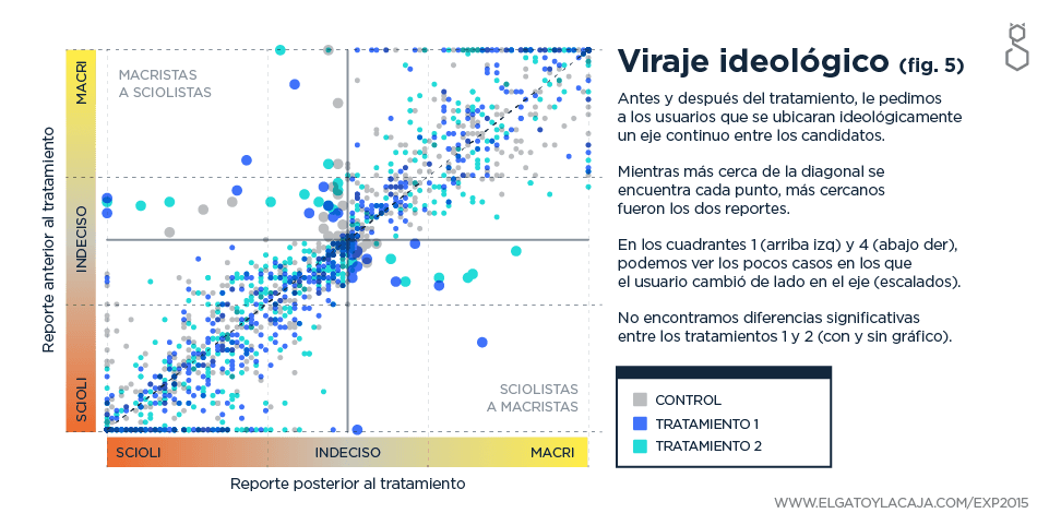 Respecto de los tratamientos, lo interesante fue poder observar cómo diferentes votantes son manipulables de diferentes maneras, siendo particularmente sensibles los votantes del espectro sciolista a la manipulación de logros de gestión del gobierno actual y los del espectro macristas a que se les manipulen afirmaciones que representan críticas al mismo.