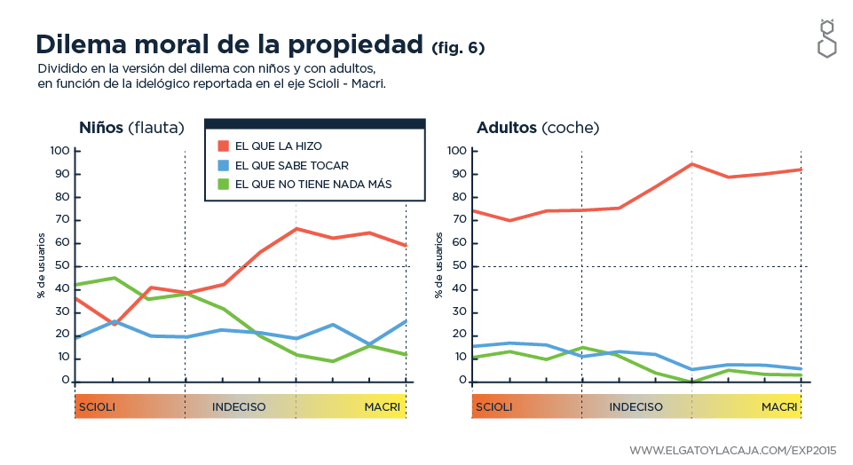 La noción de a quién le corresponde la propiedad de algo varía muy significativamente a medida que nos desplazamos en el espectro que va de Scioli a Macri (en particular, la noción de que la propiedad representada en la idea del niño que fabrica la flauta empieza por debajo del 30% en el espectro más sciolista y progresa hasta arriba del 60% en el macrista).