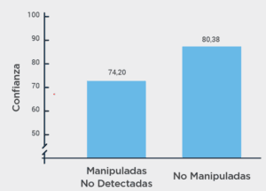Decidimos entonces comparar las confianzas en las respuestas manipuladas no detectadas (M) con las no manipuladas (NM). Para eso nos enfocamos en los 816 participantes que no habían detectado ninguno de los dos engaños (ni la primera o la tercera pregunta, que eran las manipuladas y que representaban el 35% de la muestra) y comparamos sus confianzas con las de las respuestas no manipuladas. Al hacerlo, encontramos que el 60% de ellos (492) expresaban menor confianza en las manipuladas no detectadas respecto de las no manipuladas (p < 1e-171; sí, dice e-171, en esta casa no se p hackean los resultados, Lisa). Como queríamos estar seguros, para descartar que estas diferencias tuvieran que ver con el grado de acuerdo (ya que habíamos visto que acuerdo y confianza sí estaban relacionados el uno con el otro), hicimos un segundo análisis. Esta vez comparamos las confianzas para respuestas manipuladas no detectadas contra las no manipuladas, pero normalizando por el grado de acuerdo. Como en las respuestas manipuladas el acuerdo era siempre 40 o 60 (elegimos que el sistema, al engañar, les presentara a las personas una respuesta que siempre fuese contraria a su postura original pero no extremadamente opuesta), las comparamos con las respuestas no manipuladas que tuvieran acuerdo entre 35 y 45 o entre 55 y 65, respectivamente. Así vimos que mientras que en las respuestas no manipuladas la confianza promedio era de 80 +/- 0.03, en las manipuladas no detectadas (o deberíamos decir no reportadas), la confianza era de 74 +/- 0.01.