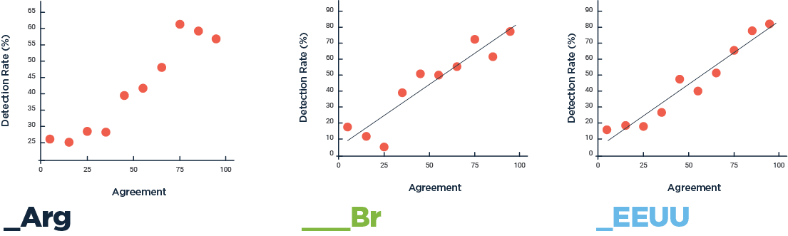 En 2015 aprovechamos las elecciones presidenciales (el ballotage, estrictamente) para ‘engañar’ a personas, o más bien para comprender el proceso de autoengaño con la ayuda de muchísimos voluntarios. Nuestra ventaja fue que, además de preguntarles ‘qué foto te gusta más’ (lo que en nuestro caso era ‘estás a favor o en contra de esta propuesta’), les podíamos preguntar cuánto. Los resultados nos permitieron no sólo observar y confirmar que el fenómeno de ceguera de la elección (la justificación retrospectiva vía Intérprete de decisiones que no tomamos) estaba fuertemente presente, sino que además pudimos ver que la detección dependía directa y linealmente del nivel de acuerdo. Qué tanto te gusta o disgusta la foto (o qué tan de acuerdo o en desacuerdo estás respecto de una idea) hacía que fuese muy distinta la tasa de engaño.