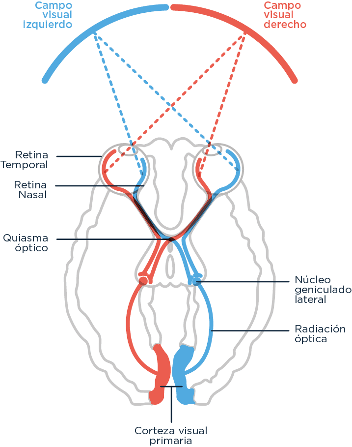 Así funcionan los ojos. Por un lado, este esquema aclara pero complejiza la idea de que ‘cada ojo manda información al hemisferio opuesto’. Esto no es exactamente así, sino que cada ojo tiene dos mitades que mandan información por dos vías. El ojo derecho recoge información que viene desde SU derecha y SU izquierda, y lo mismo el izquierdo. Esa información va a recorrer un camino que puede ir directo al mismo hemisferio (ipsilateral) o atravesar el quiasma óptico y pasar al otro hemisferio (contralateral). La clave está en que toda la información visual sobre lo que pasa en nuestro ‘lado derecho’, llega al hemisferio izquierdo, independientemente de por qué ojo entre, y viceversa.
