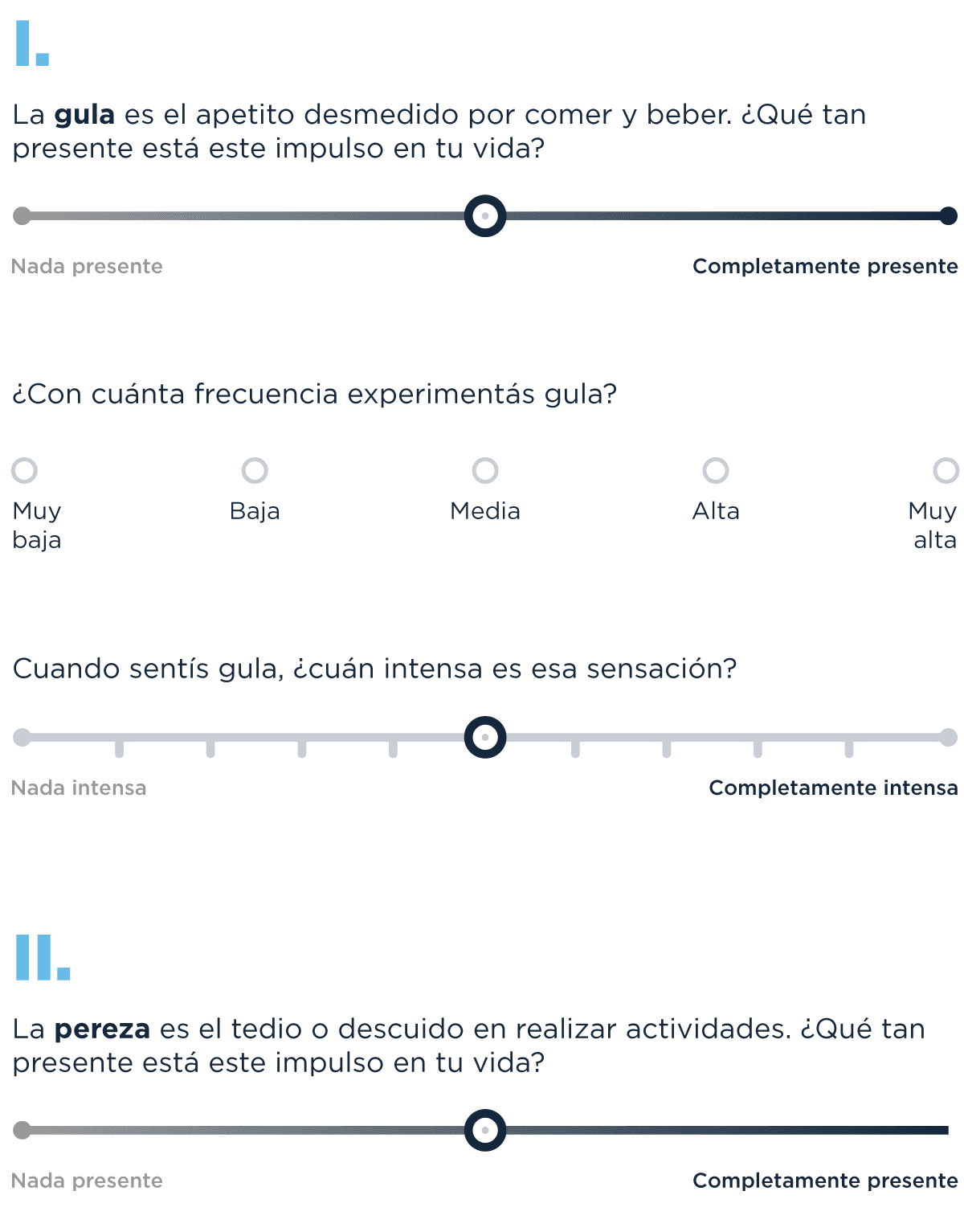Las preguntas eran dos para cada pecado; siguiendo con el ejemplo para gula: ¿Cuánto te molesta (la gula) en vos?, ¿Cuánto te molesta (la gula) en otras personas? Las respuestas van desde ‘no me molesta nada’ (0 en nuestra escala) hasta ‘me es completamente insoportable’ (100 en la escala).