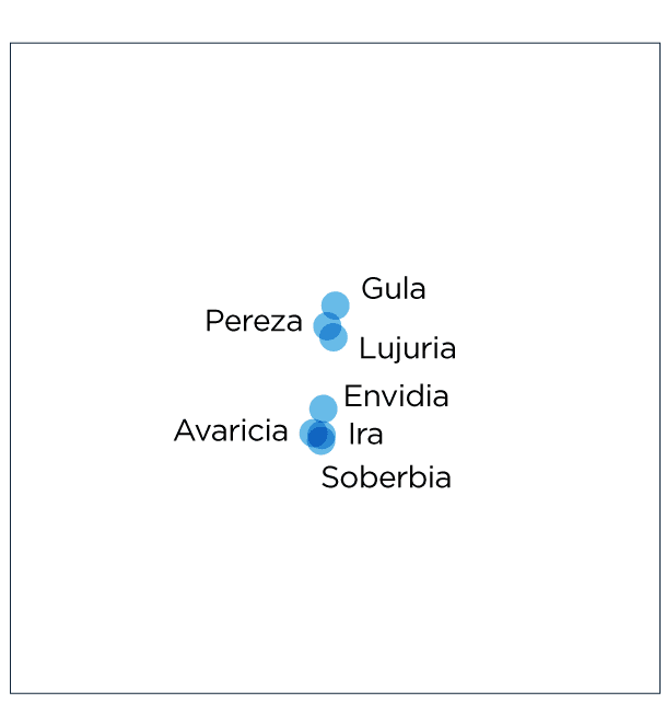 Sin necesidad de recurrir esta vez a sofisticadas técnicas de agrupamiento, el efecto es claro: de forma libre y sin ninguna consigna explícita que se los pida, las personas ubicaron la pereza, la gula y la lujuria de forma cercana entre sí, mientras que los pecados avaricia, envidia, ira y soberbia aparecen también juntos, pero separados en otro lugar del espacio. El gráfico de arriba es claramente consistente con la categoría que el PCA ya encontró desde un principio y que vimos a lo largo de todo el experimento.