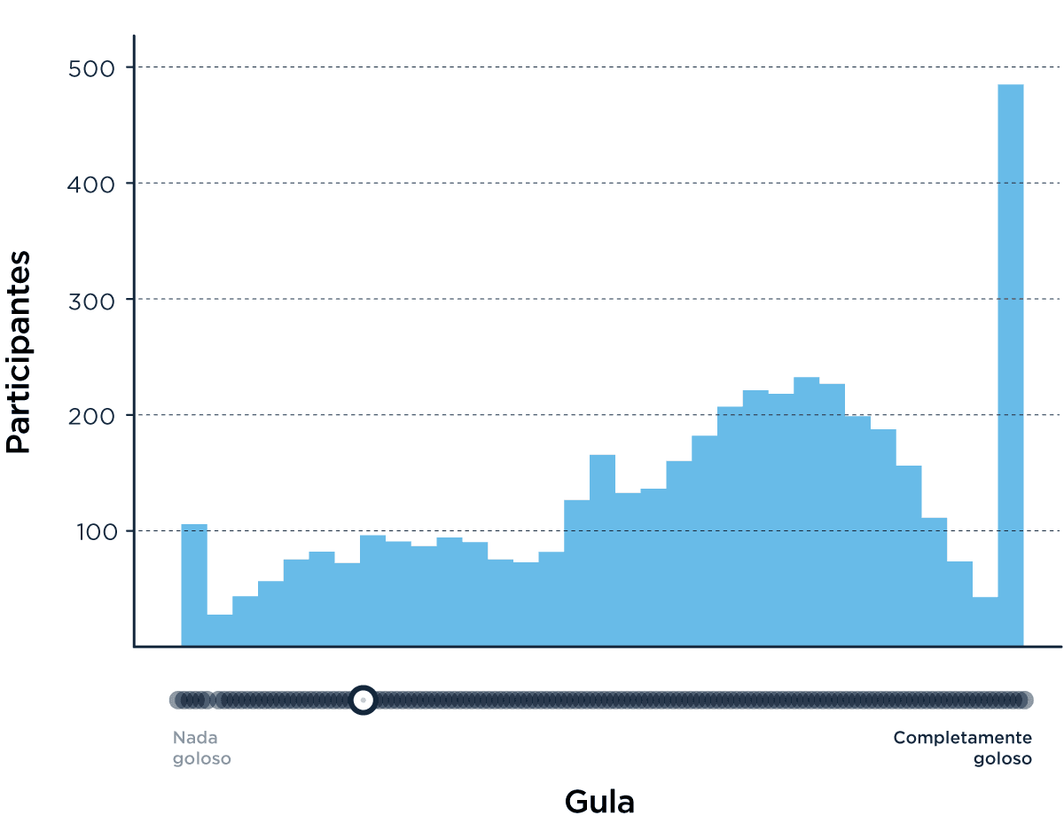 Cantidad de participantes que reportaron un dado valor para la presencia de gula en sus vidas; es decir, histograma de distribución, siendo 0 ‘nada presente’ y 100 ‘completamente presente’. Cada uno de los círculos negros en la parte inferior es una respuesta de cada participante. A modo de ejemplo para el análisis que sigue, el círculo gris (más grande) es donde se ubicó un miembro de este equipo.