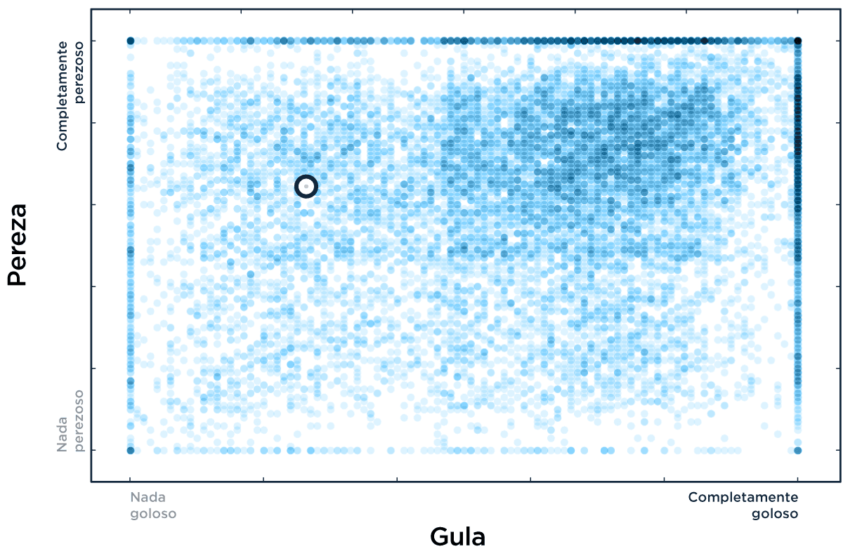 ¿Cómo se construye este gráfico? Siguiendo con el mismo sujeto de ejemplo, si respondió que tenía 26 de presencia de gula y 64 de pereza, le corresponde el punto 26 en gula y 64 en pereza. Hacemos lo mismo entonces para el resto las 13.595 personas que analizamos hasta ahora, donde cada persona es un punto ubicado de acuerdo a cuánto declaró de gula y de pereza.