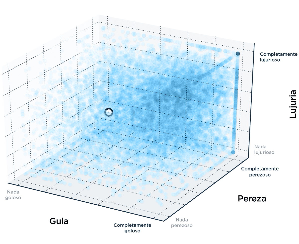 Es difícil mirar una cantidad tan grande de puntos, pero las concentraciones que vemos en los distintos lugares son mucho más informativas que los histogramas anteriores por separado. Con los histogramas, necesitábamos mirar alternadamente los distintos gráficos para saber la posición en dos pecados distintos para un mismo participante. Y eso sólo es posible si marcamos los datos de una misma persona en particular. Con este gráfico de dispersión, podemos ver la posición en estos dos pecados para cada participante por separado. De las misma forma, con un gráfico de tres dimensiones podemos ver la posición de una persona en tres pecados diferentes: