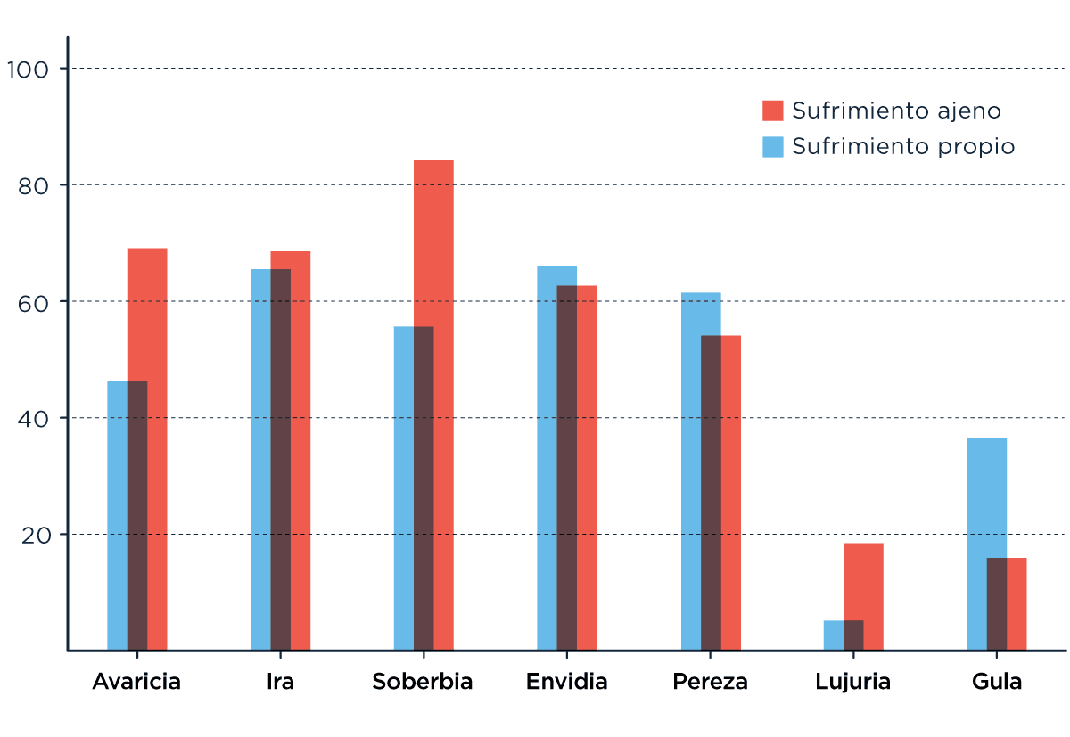 Multi: 4.2 de Gula, 3.9 Avaricia, 3.8 Ira, 3.7 Pereza, 3.7 Envidia, 3.6 Soberbia, 3.4 lujuria
