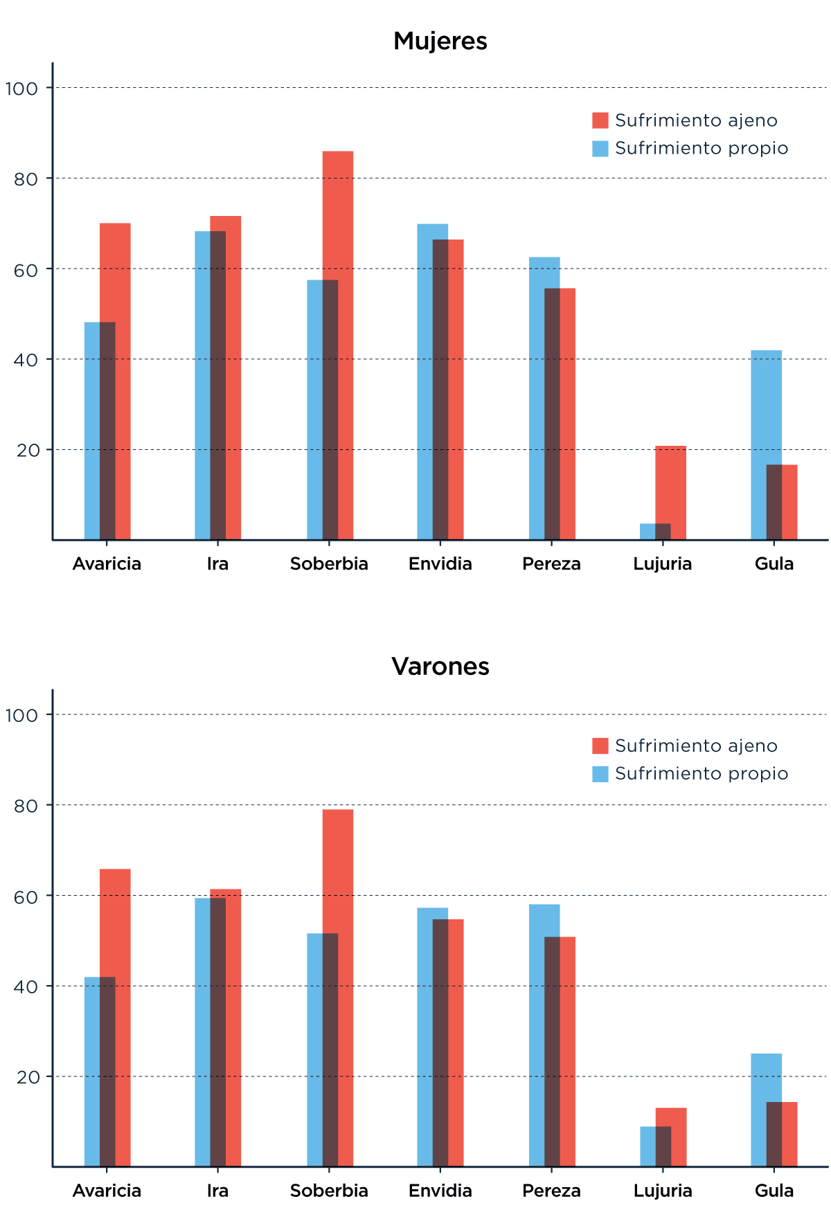 En el resto de los pecados vemos un comportamiento similar entre ambos géneros en cuanto a cómo declaramos que nos afectan: envidia, ira y pereza se sufren en niveles relativamente altos, siendo parejo el padecimiento del impulso propio y el ajeno; en cambio avaricia y soberbia consistentemente molestan más en el otro que en uno.