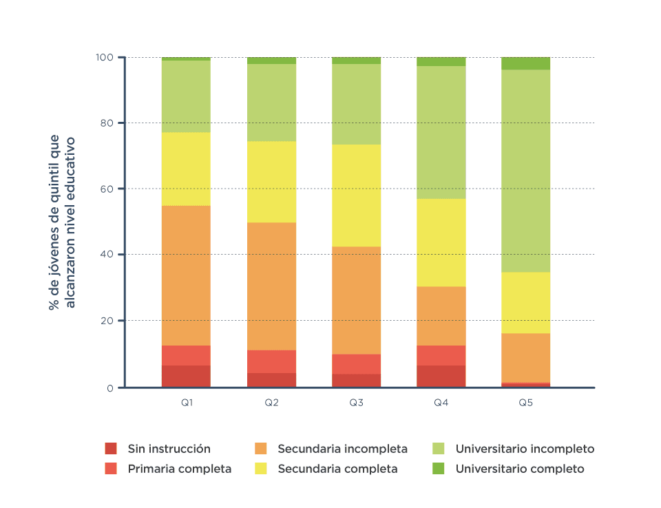Los datos indican que en los hogares de ingresos más bajos predominan logros educativos modestos, mientras que cuanta más plata entra en casa, se completan estudios de mayor nivel. Al comparar los valores extremos de la distribución socioeconómica (el primer y el último quintil) se ve la expresión más cruda de la desigualdad de logros educativos: la mayoría de los jóvenes de menores ingresos no ha completado siquiera los estudios secundarios mientras que la mayoría de los más aventajados en la distribución del ingreso accedió e incluso, en algunos casos, logró completar la formación universitaria.