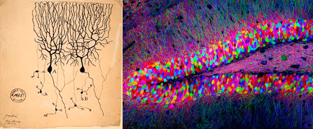 Como un antes y un después pero con colores. A la izquierda, lo que se imaginó Ramón y Cajal de puño y neurona. A la derecha, lo que podemos ver ahora con un microscopio.