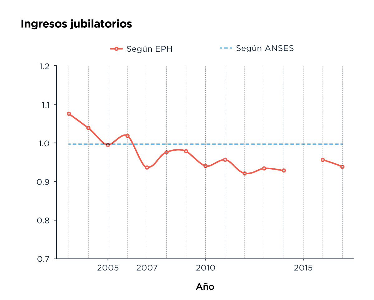 En este gráfico comparamos los datos de ingresos jubilatorios en EPH con los de ANSES (Administración Nacional de la Seguridad Social). Como en el gráfico de arriba, si la relación entre las dos fuentes fuese estable, la línea debería ser horizontal. Y lo que vemos es que el ingreso jubilatorio de EPH es cada vez más bajo que el que corresponde a los datos de ANSES.