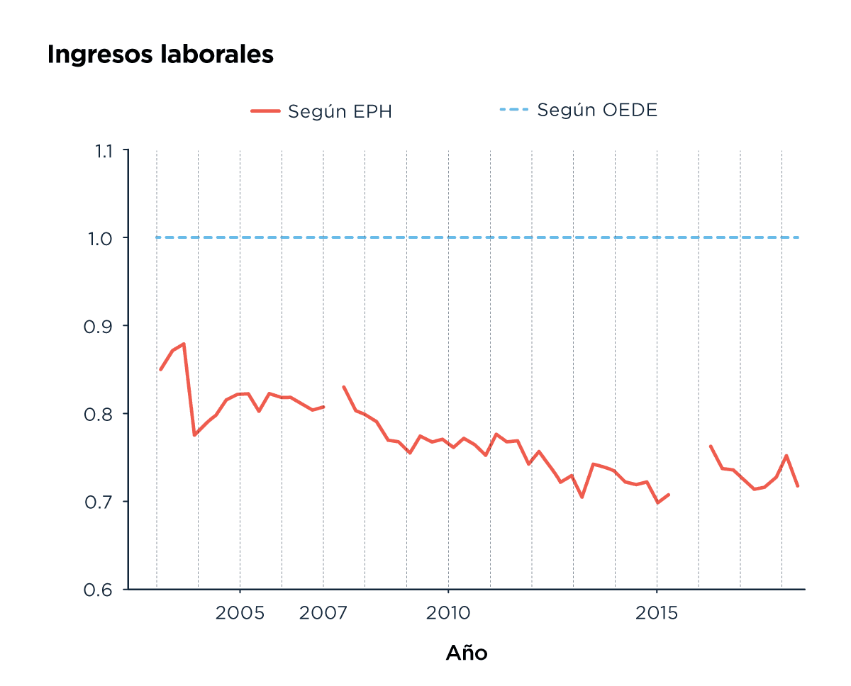 En este gráfico comparamos los datos sobre ingresos laborales en EPH con los de otra fuente, OEDE (Observatorio de Empleo y Dinámica Empresarial). En cada punto de la serie, los valores de OEDE están representados con el valor 1. Los de EPH están representados como la proporción que representan de esa unidad. Para interpretar el gráfico tenemos que pensar que, cuanto más horizontales evolucionen las líneas, va a significar que más estable va a ser la relación entre los datos de la EPH y los de la otra fuente. Pero lo que vemos es que, desde 2007, los ingresos de la EPH son cada vez más bajos que los de la otra fuente. Por eso, representan un porcentaje cada vez menor de los datos en esa fuente. Después de 2015 vemos que hay, abruptamente, una pequeña mejora en esa relación.