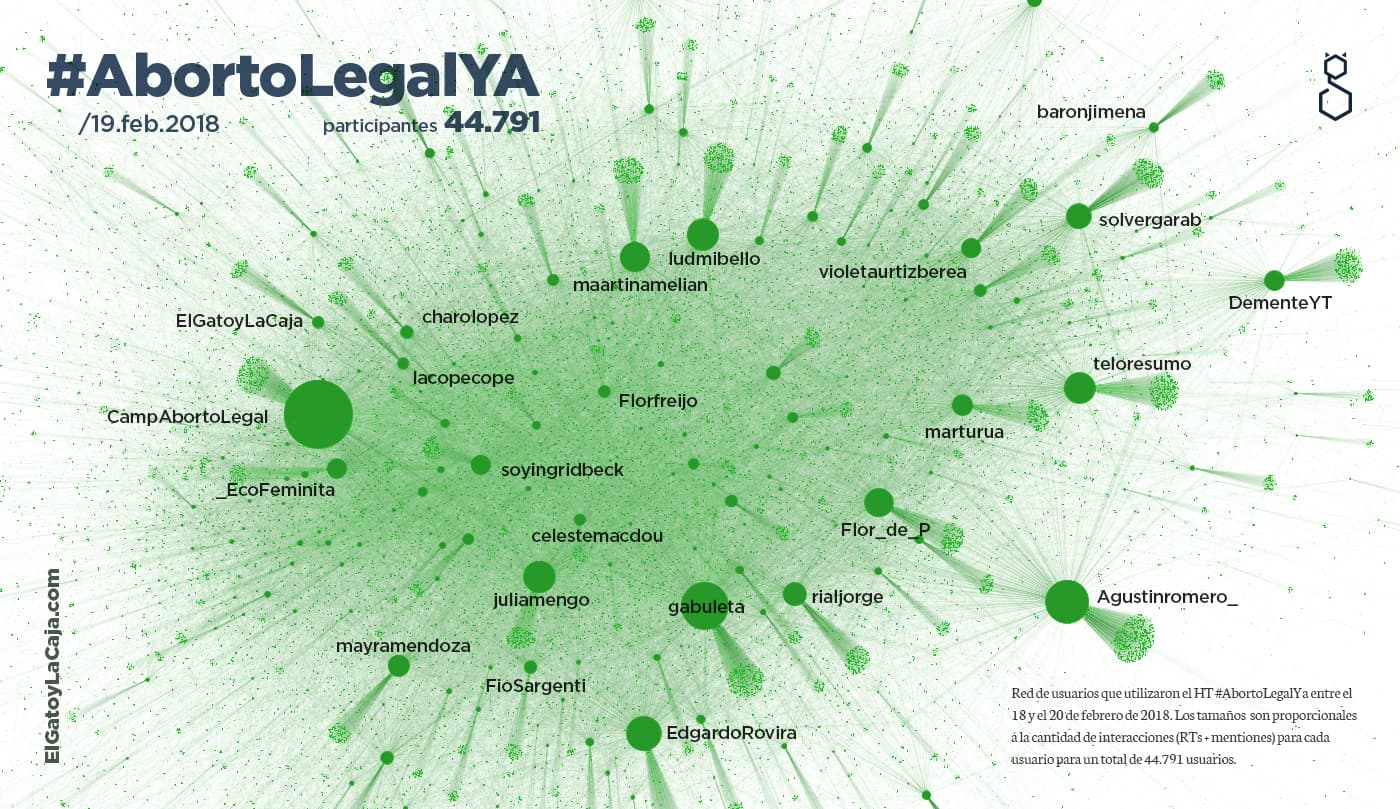Ver la foto final es hermoso pero también es potente, al notar la heterogeneidad de esos agentes clave. Desde los más bien obvios por trayectoria (como @campabortolegal, @ecofeminita, @juliamengo o @soyingridbeck) o por coyuntura (como @rialjorge) a cuentas como la de @teloresumo o @dementeYT (que vienen de crear productos re exitosos en YouTube), podemos ver que fueron muy influyentes en la conversación, abriendo territorios más alejados de aquellos en los que participan los agentes de trayectoria más cercana al tema.