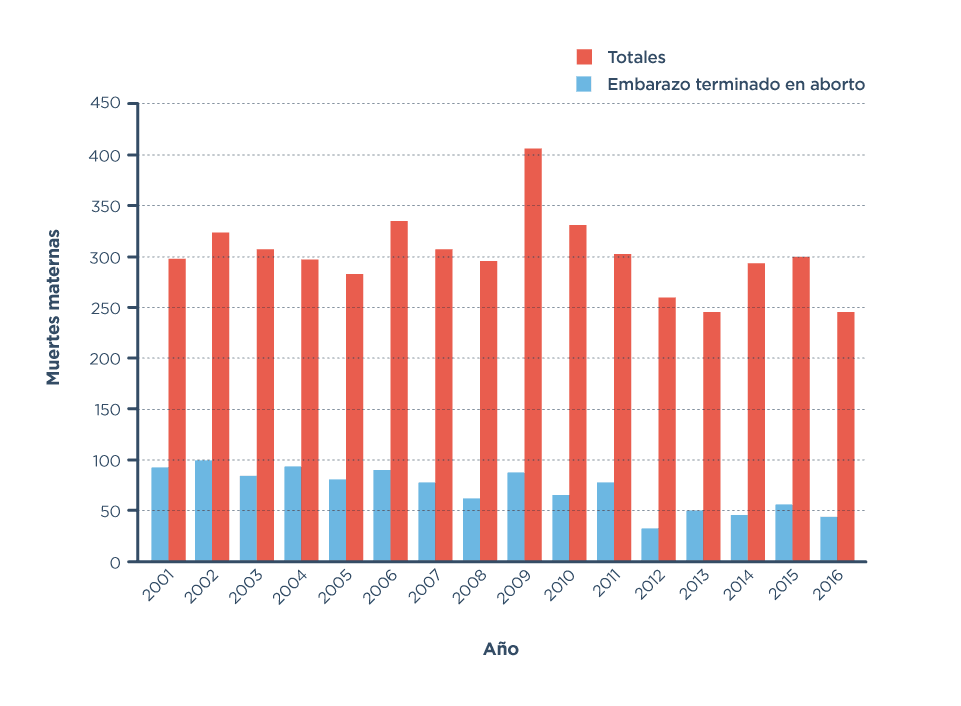 De acuerdo con información de Estadísticas vitales del Ministerio de Salud, disponibles desde 2001, en Argentina la cantidad de muertes en este milenio por ‘embarazo terminado en aborto’ han ido de un máximo de 100 a un mínimo de 43 por año, representando entre el 31,3% y el 12,8% de las muertes maternas totales. Vale aclarar que si bien los datos no distinguen entre abortos espontáneos o inducidos, las evidencias muestran que la mortalidad está asociada casi siempre con su inducción en condiciones de inseguridad (algo que se desprende de las bajas o nulas tasas de mortalidad materna a las que se asocia el aborto en los países donde se realiza en condiciones seguras).