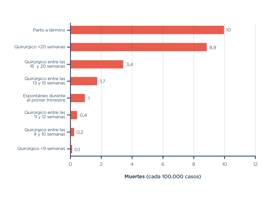 Los gráficos de abajo muestran que mientras un aborto legal es más seguro que un parto, las tasas de letalidad de un aborto inseguro pueden ser muy altas.