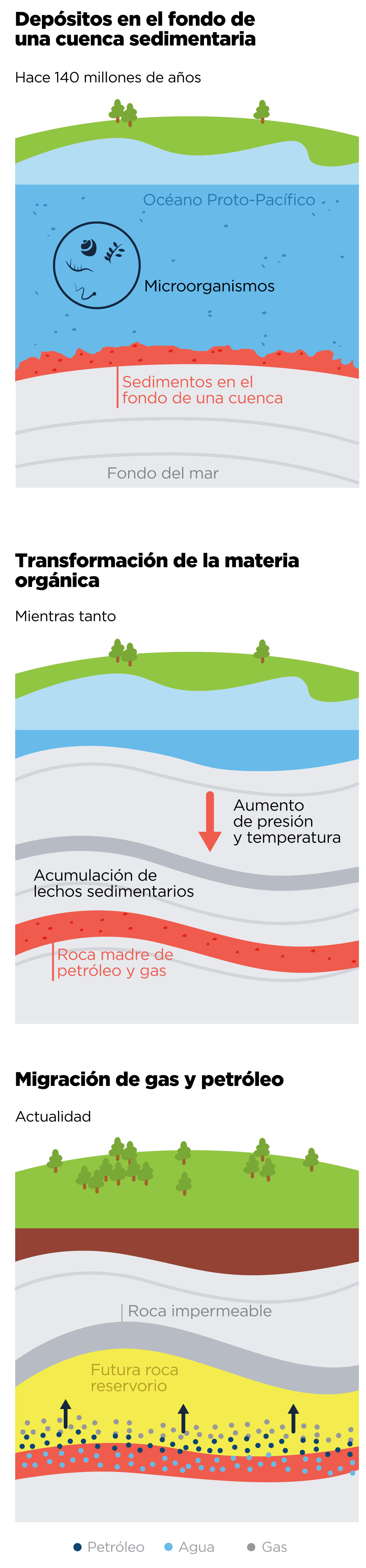 Hace unos 150 millones de años la región de la Cuenca Neuquina estaba toda inundada y en el fondo de ese mar se estaban depositando los sedimentos que mucho tiempo después darían origen a lo que hoy conocemos como Formación Vaca Muerta. Las rocas sedimentarias que se forman en el fondo del mar muchas veces están acompañadas de restos de algas y organismos marinos muy pequeños (fitoplancton y zooplancton), que pueden no descomponerse inmediatamente y se terminan preservando como materia orgánica. Esto se debe a que a ciertas profundidades el agua circula poco y el oxígeno escasea, por lo que el ambiente se comporta como una pileta descuidada después de un largo invierno.