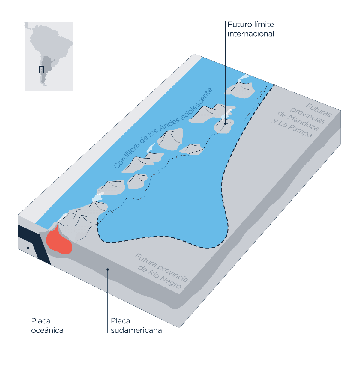 Pero entonces, ¿dónde quedó la Formación Vaca Muerta? En muchos lugares. Porque con casi toda la provincia de Neuquén, parte de Mendoza, Río Negro y La Pampa cubiertas por ese mar durante varios millones de años, en cuyo fondo se depositó la Formación, podemos imaginar que su extensión es enorme. En algún momento estuvo completamente cubierta por las rocas que se depositaron después, pero como la historia de la Tierra es súper dinámica, hace 45 millones de años la Cordillera de los Andes ya estaba bastante elevada y seguía elevándose aún más, lo que generó el levantamiento de parte de esa cubierta sedimentaria, permitiendo que hoy podamos encontrar a la Formación Vaca Muerta asomando en distintos lugares de la superficie terrestre, como cerros, montañas, montañitas.