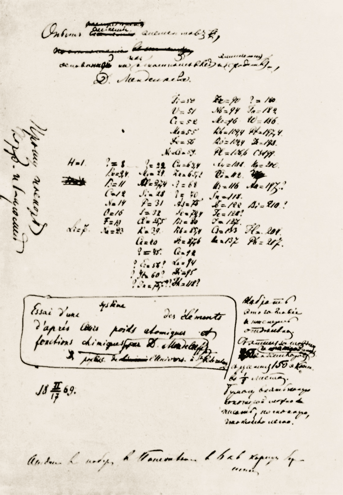 Primera versión de tabla periódica de los elementos escrita a mano por el mismísimo Dmitri Mendeléyev. Y no, no era médico.