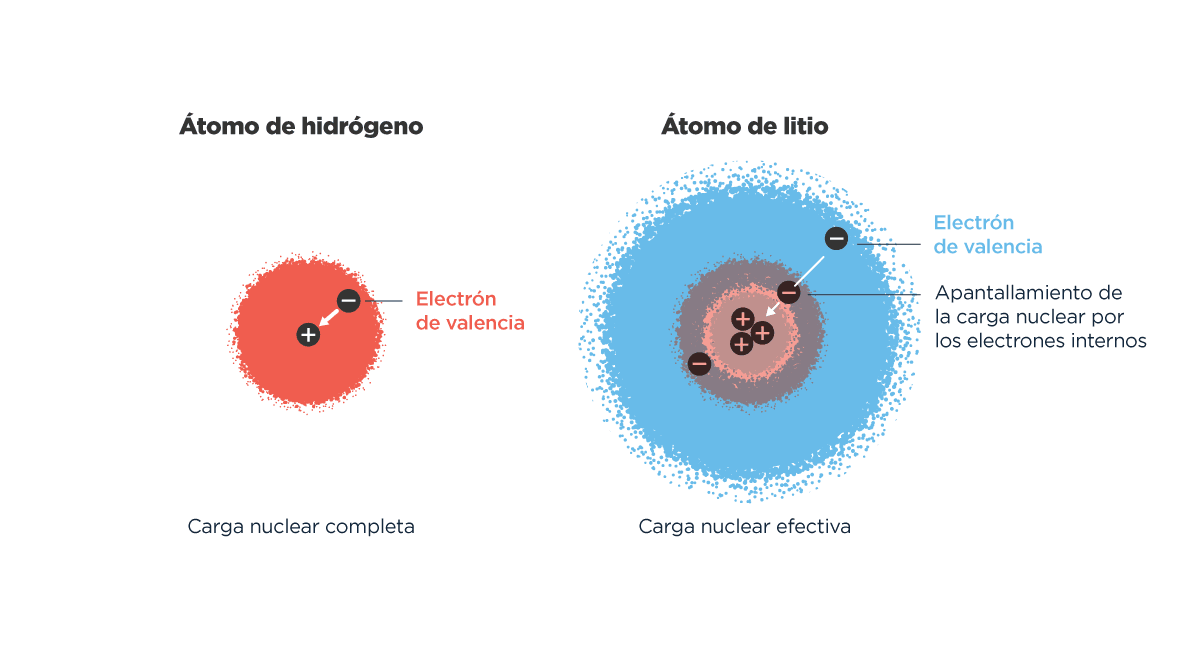 Imaginemos ahora este átomo más complejo, alguno con varios protones, como el litio, por ejemplo. Este núcleo recontra positivo tiene ahora la difícil tarea de atraer, al mismo tiempo, a todos los electrones que lo andan revoloteando. Y lo va a hacer muy bien con los electrones que tenga cerca, esos que ocupan los orbitales más internos. Sin embargo, se le va a complicar bastante con los que estén más lejos. Este fenómeno se conoce como “apantallamiento” y, básicamente, implica que la fuerza de atracción que sienten los electrones más externos disminuye por la presencia de otros más internos. De esta manera, los electrones más alejados son menos atraídos hacia el centro del átomo y experimentan lo que se conoce como “carga nuclear efectiva”, que es siempre menor respecto de la carga nuclear completa.
