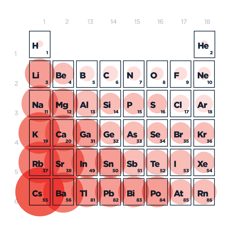 Por otro lado, si nos movemos de arriba hacia abajo en la tabla –digamos, del litio al cesio– también aumenta el número atómico, claro. Pero en este caso, con el aumento de la cantidad de protones, los electrones que se suman se ubican en orbitales nuevos, uno sobre otro, cada vez más lejos del núcleo. Por el aumento de la carga nuclear, este núcleo podrá atraer con mayor fuerza a los electrones que quedaron en los orbitales más cercanos al centro del átomo. Sin embargo, como explicamos un poco más arriba, los electrones internos apantallan la capacidad de atracción del núcleo sobre los más externos. De esta manera, a medida que bajamos por el grupo, el átomo es cada vez más grande por los nuevos orbitales que se agregaron. Además, por el apantallamiento de la carga nuclear, la fuerza de atracción entre los electrones de valencia y el núcleo es cada vez menor.