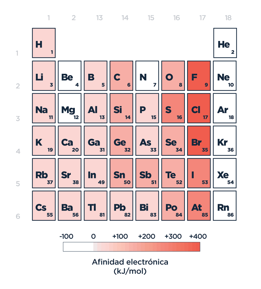 Pero la historia no termina ahí. La acaparadora fuerza de atracción de los elementos más pequeños, esos que están hacia la derecha y arriba de la tabla, no se limita a su propia existencia. Atraen constantemente más y más electrones. Esta afinidad de los elementos por los electrones se conoce como, obviamente, “afinidad electrónica”, y representa la energía que se libera cuando un átomo neutro capta un electrón para formar un átomo cargado negativamente (anión). Este acto de liberar energía, sacársela de encima, significa para el elemento pasar a un estado más estable. Más tranquilo. Más relajado. Y eso está bueno. Siguiendo una relación inversa con la disminución del tamaño del átomo, la afinidad electrónica aumenta hacia arriba y a la derecha de la tabla y explica la capacidad creciente de estos elementos de captar nuevos electrones.