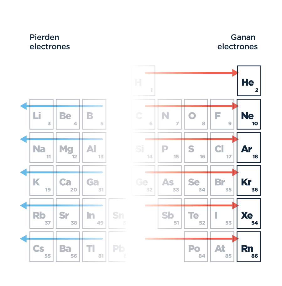 Por su menor tamaño y alta afinidad electrónica, los elementos que están a la derecha de la tabla periódica tienen una alta tendencia a ganar electrones. Por el contrario, los elementos que se encuentran del lado izquierdo, de mayor tamaño y menor energía de ionización, los pierden fácilmente.