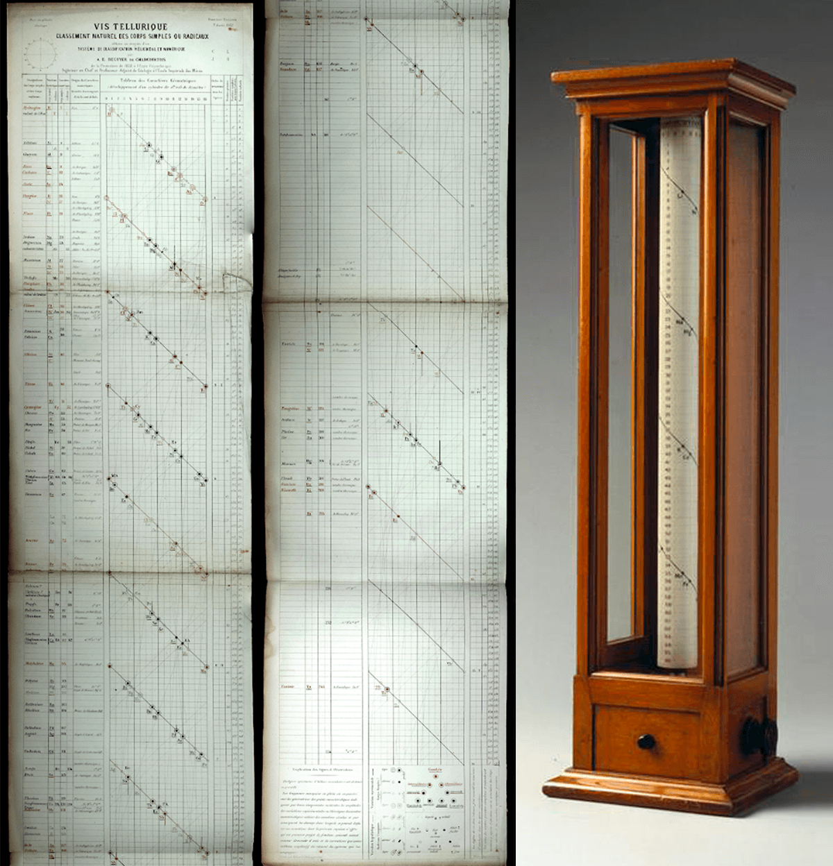 Allá por el 1862, el geólogo francés Alexandre-Émile Béguyer de Chancourtois alineó los elementos conocidos hasta el momento según su peso atómico. Para ello dibujó una complicada hélice sobre la superficie de un cilindro dividido en dieciséis partes. Algo bastante rebuscado, pero con el oxígeno como referencia y el telurio en el centro, elementos parecidos caían uno debajo del otro. Vis tellurique (tornillo telúrico) lo nombró, y pasó a la historia como el primero en notar cierta repetitividad al ordenar los elementos de esta manera.